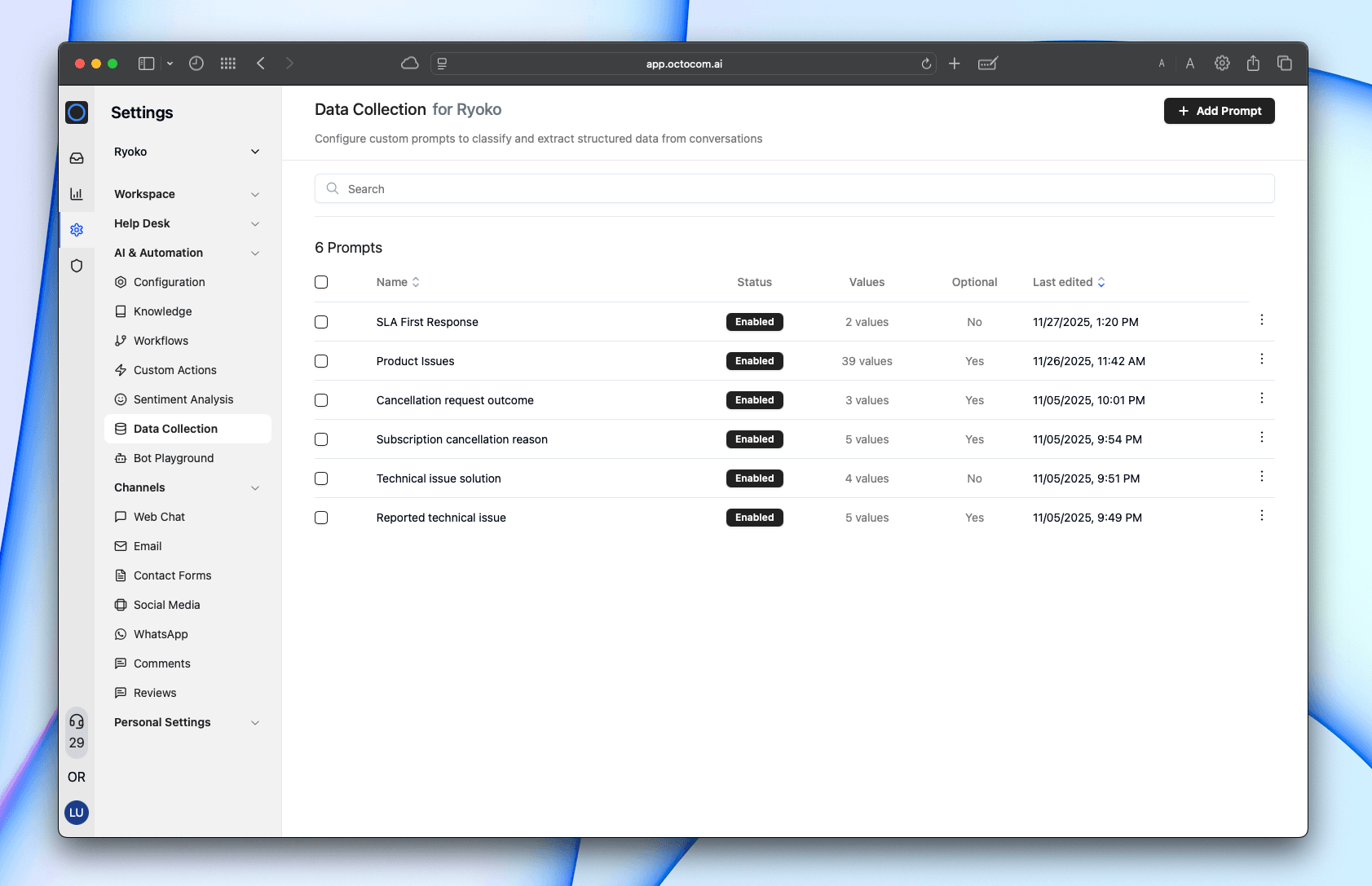 Create and manage data fields in Settings → AI & Automation → Data Collection.