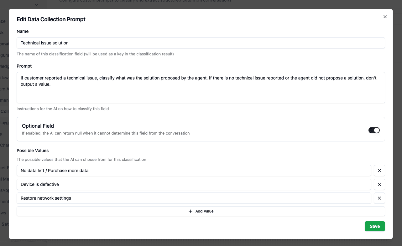 The core idea is simple: each data collection field is an AI prompt that runs against the full conversation after it closes. You tell the AI what to look for, give it the possible values, and it classifies every conversation automatically.