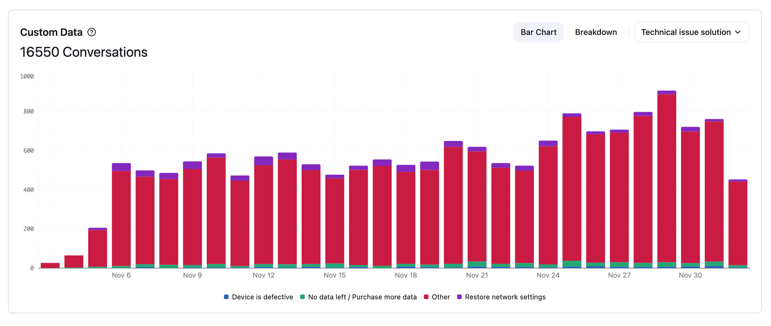 | Technical issue solution | What solution the agent proposed | No data left, Device is defective, Restore network settings, Other |
